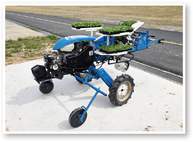 ‘흙올림 휴립피복기’는 여름철 배추 재배양식에 맞게 1조식으로 제작 중인 장비로, 두둑 성형과 비닐 피복, 그리고 비닐 위에 흙을 덮는 작업까지 한 번에 수행할 수 있어 노동력을 크게 줄일 수 있다. ‘보행형 1조식 자동 정식기’ 역시 노동력 절감에 효과적이다. 이 장비는 배추를 비롯해 고추·양배추·상추·콩·옥수수 등 다양한 작물에 적용할 수 있으며, 국내 표준 규격의 기계 정식용 육묘 트레이에 맞춰 개발됐다. 외국산 장비와 성능은 대등하지만 가격은 절반 수준이다. 특히 다양한 포장 조건에 대응할 수 있어, 인력 대비 약 85%의 노동력과 30%의 비용 절감 효과를 기대할 수 있다.