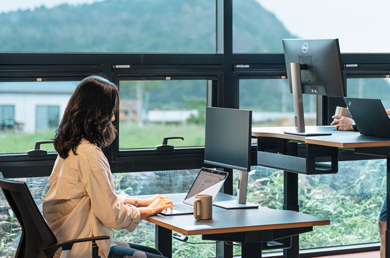 한적한 사계리의 길을 따라가다 보면 만날 수 있는 오피스제주 사계점. 이곳은 관광객보다는 현지인과 워케이션을 위한 공간으로, 깊은 업무 몰입을 도와준다. 총 40석 규모의 오피스 공간은 넉넉하며, 모션 데스크가 마련돼 있어 장시간 앉아 일하는 이들에게 특히 적합하다. 회의나 미팅을 위한 별도 룸도 갖춰져 있어 협업이 필요한 이들에게 유용하다.