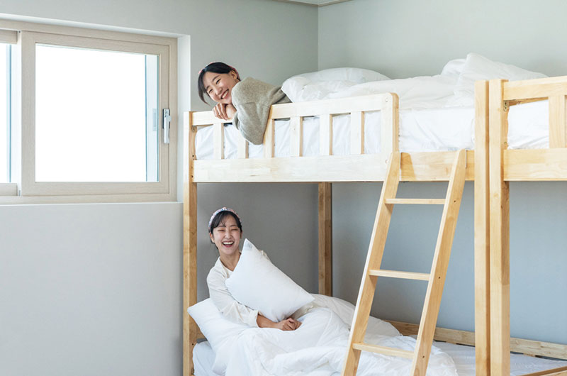 건물 앞에는 탁구장과 농구장이 있어 짧은 휴식 시간에 가볍게 몸을 풀 수 있고, 자전거를 대여해 근처를 둘러보는 것도 가능하다. 휴식 공간에서는 다른 이용자들과 자연스럽게 교류할 수 있다. 침대·냉장고·책상·의자 등 생활 비품도 잘 갖춰져 있어 장기 체류에도 무리가 없다.