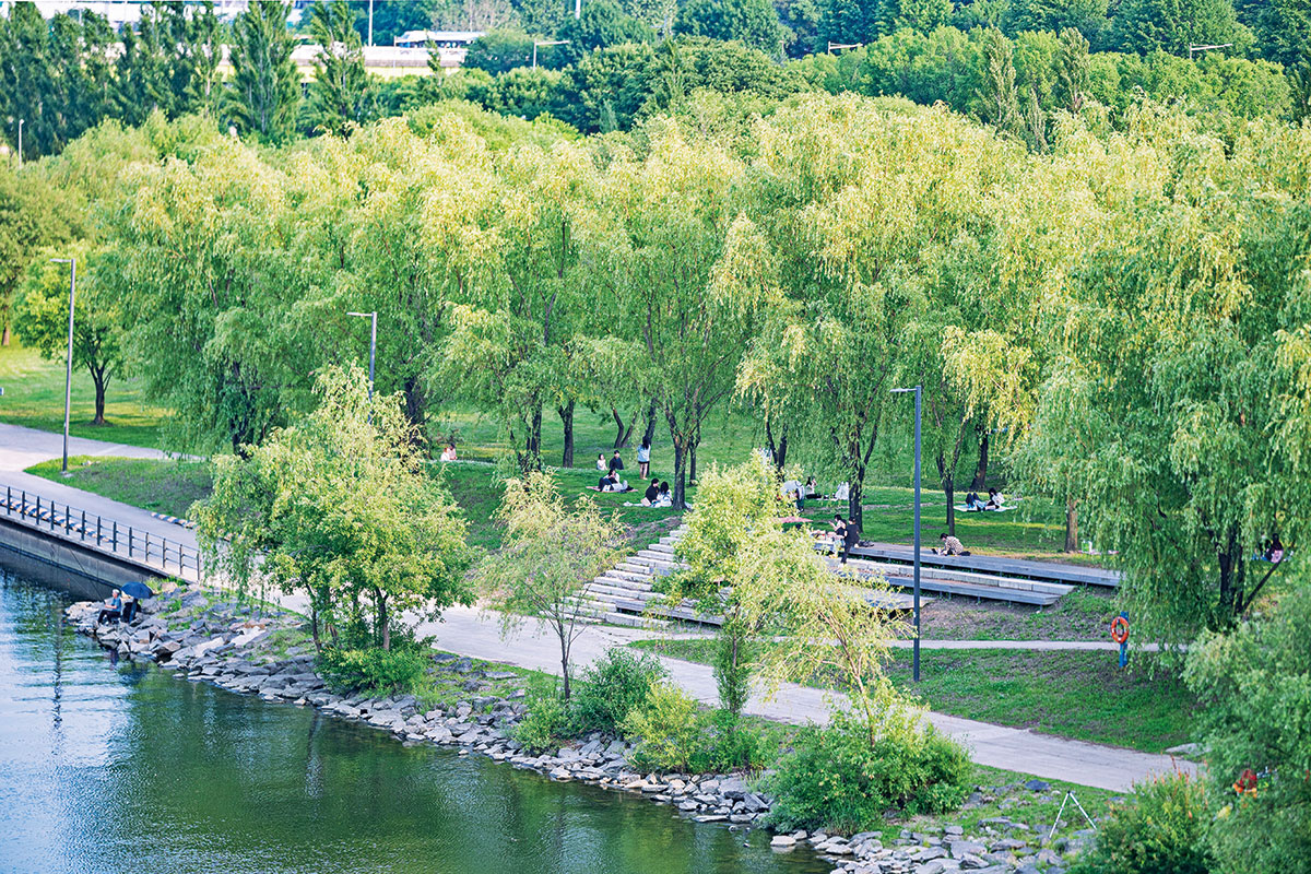 무엇보다 이곳은 한강 유일의 습지로 버드나무, 갈대, 억새 등이 군락을 이루는 도심 속 오아시스 같은 공간이다. 서울 한복판에 있다는 것이 믿기지 않을 만큼, 온갖 야생화를 비롯해 버들치, 송사리, 붕어까지 다양한 생물이 살아 숨 쉰다. 주민은 물론 직장인들도 즐길 수 있도록 약 6km 길이의 산책로가 조성돼 있으며, 최근에는 흙길 산책로가 마련돼 맨발로 걷는 사람도 늘고 있다.