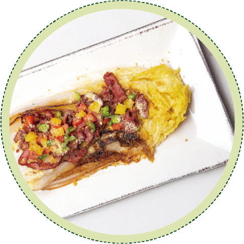 - 2 달군 팬에 올리브유를 두르고 베이컨, 양파, 파프리카를 볶는다. 양파가 투명해지면, 그 위에 배추를 단면이 닿도록 올려 앞뒤로 노릇하게 굽는다.