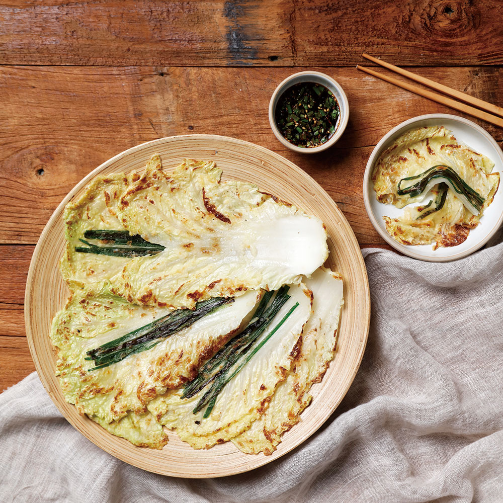 - 3 중간 불로 달군 팬에 식용유를 두르고 배추를 앞뒤로 2분간 노릇하게 구워낸다.